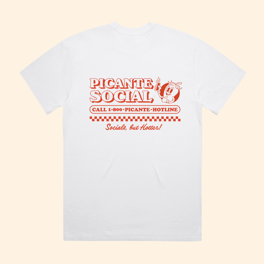 Boxy fit white Picante Social t-shirt. Unisex, boxy style available in a range of sizes.